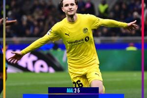 体育资讯02月25日讯 欧冠1/8决赛附加赛次回合,博德闪耀2-1双杀国米晋级16强。