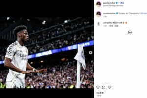 他也在赛后通过社媒晒出自己模仿詹姆斯的经典双手下压庆祝照,并配文:“在主场,在欧冠!!@皇家马德里 ?”