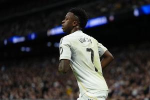 体育资讯3月23日讯 西甲第29轮比赛,维尼修斯点射破门,目前皇马主场2-2马竞。