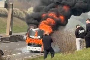 大巴在M6高速路边燃起大火的图片在网络上流传,消防人员则在奋力控制火势,大巴上的乘客当时正前往温布利球场观看曼城与阿森纳的决赛。