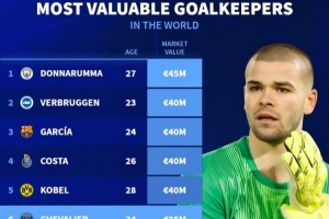 体育资讯3月25日讯 德国转会市场统计了门将的最新身价,并列出榜单,多纳鲁马4500万欧居首,维尔布鲁根、霍安·加西亚、迪奥戈·科斯塔、科贝尔4000万欧。