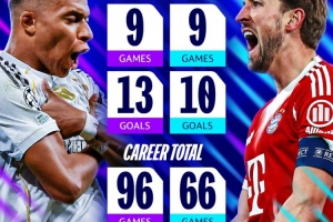 本赛季,姆巴佩和凯恩均在欧冠中出战9场比赛,姆巴佩打进13球,凯恩则打进10球。职业生涯迄今为止,姆巴佩96场欧冠打进68球,凯恩则是66场欧冠打进50球。