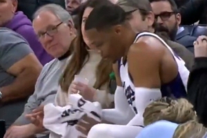 GIF-威少冲出界外 踩爆了场边的啤酒瓶 酒花飞溅