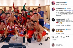 马竞前锋朱利亚诺·西蒙尼社媒晒出与队友们在更衣室内的大合照,配文:“爱上马竞,这种情感你无法理解!我们晋级决赛了!加油,永远!”